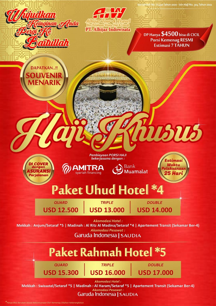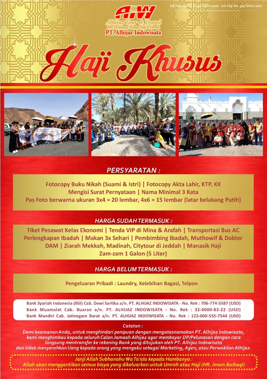 Alhijaz Indowisata adalah Travel Haji Plus atau Haji Plus terpercaya di Indonesia. Travel resmi Kementerian Agama RI AKREDITASI “A” dengan izin Umroh PPIU No.U490/2020 dan izin Haji PIHK No. KMA 304/2022. Adapun Syarat Pendaftaran Haji Khusus ialah :